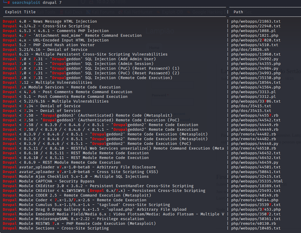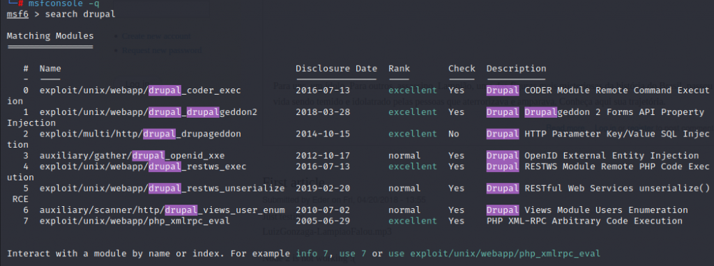 8. Msfconsole kullanarak sisteme sızmaya çalışalım. search drupal diyerek arama yapıyorum