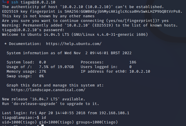 11. Şimdi makinenin içinde gezelim. İlk home dizinine gidince burada bir tiago isimli kullanıcı olduğunu görüyorum. SSH portum açık olduğu için tiago’ nun şifresini hydra ile kırmaya çalışacağım.